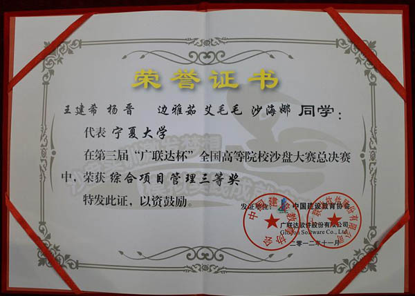 11月23至25日,由中国建设教育协会主办,广联达软件股份有限公司承办,集美大学承办的第三届“广联达杯”全国高等院校工程项目管理沙盘模拟大赛在集美大学诚毅学院举行。我院派出由张学科老师带队,2009级工程管理专业王建希和2010级工程管理专业杨晋、沙海娜、艾毛毛、边雅茹5名同学组成的代表队参加了比赛,经过1天白热化的角逐,获得综合项目管理三等奖,指导老师张学科获“优秀指导老师”称号。