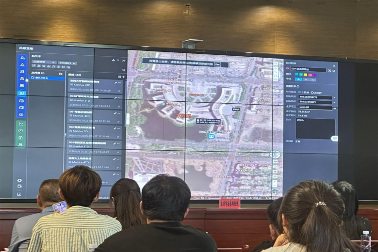 在工作人员的引导下,师生们首先参观了银川市无人机场站,详细了解了不同型号无人机(包括固定翼、多旋翼)的性能特点、维护保养流程以及其在应急测绘、大范围地形测绘中的关键作用。随后,大家移步至“凤眼慧瞰”低空无人机智能平台展示中心,这里集中展示了银川勘测院在无人机数据处理与应用方面的最新成果。平台强大的实时传输、智能航线规划、精准三维建模及在工程质量巡检、土方量计算、灾害监测等场景的深度应用案例,让同学们深刻感受到低空遥感技术的效率与魅力。