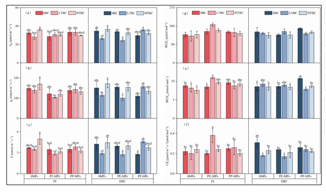 DRC放大了生物炭和微塑料对玉米形态生理特征的改变。例如,在DRC条件下,聚乙烯微塑料(PE-MPs)增加了总干物质(TDM)、叶片及整株的WUE。
