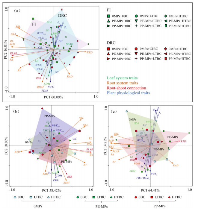 图5.玉米不同形状的主成分分析图:(a)充分灌溉(FI)和干湿循环(DRC)条件下;(b)充分灌溉(FI)条件下;(c)干湿循环(DRC)条件下,分别进行不添加(0BC;0MPs)和添加生物炭(LTBC和HTBC)以及微塑料(PE-MPs和PP-MPs)的处理。