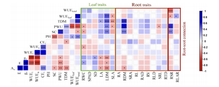 图6. BC、MPs和灌溉处理(FI和DRC)下玉米植株各性状的Pearson相关系数热图。