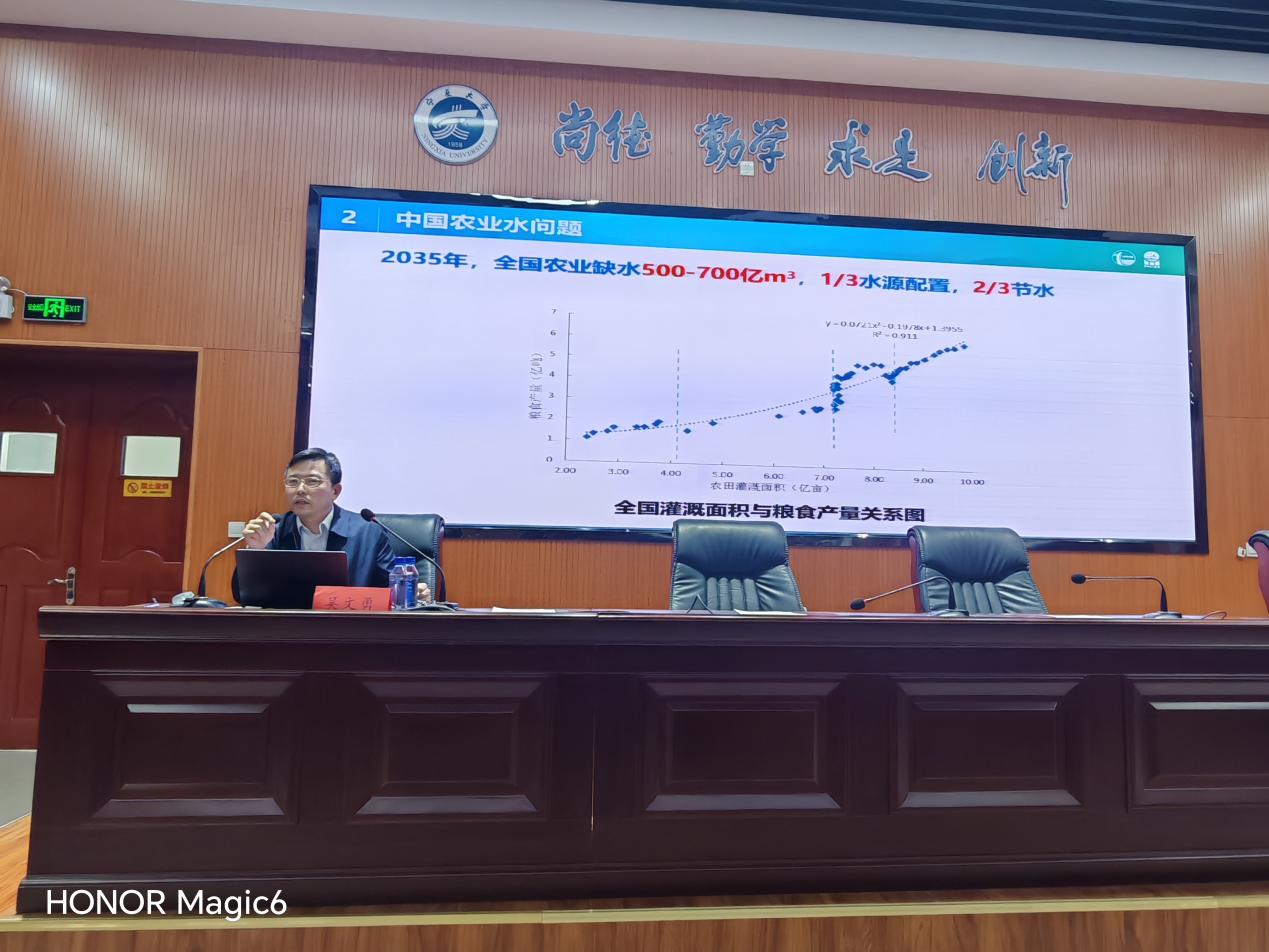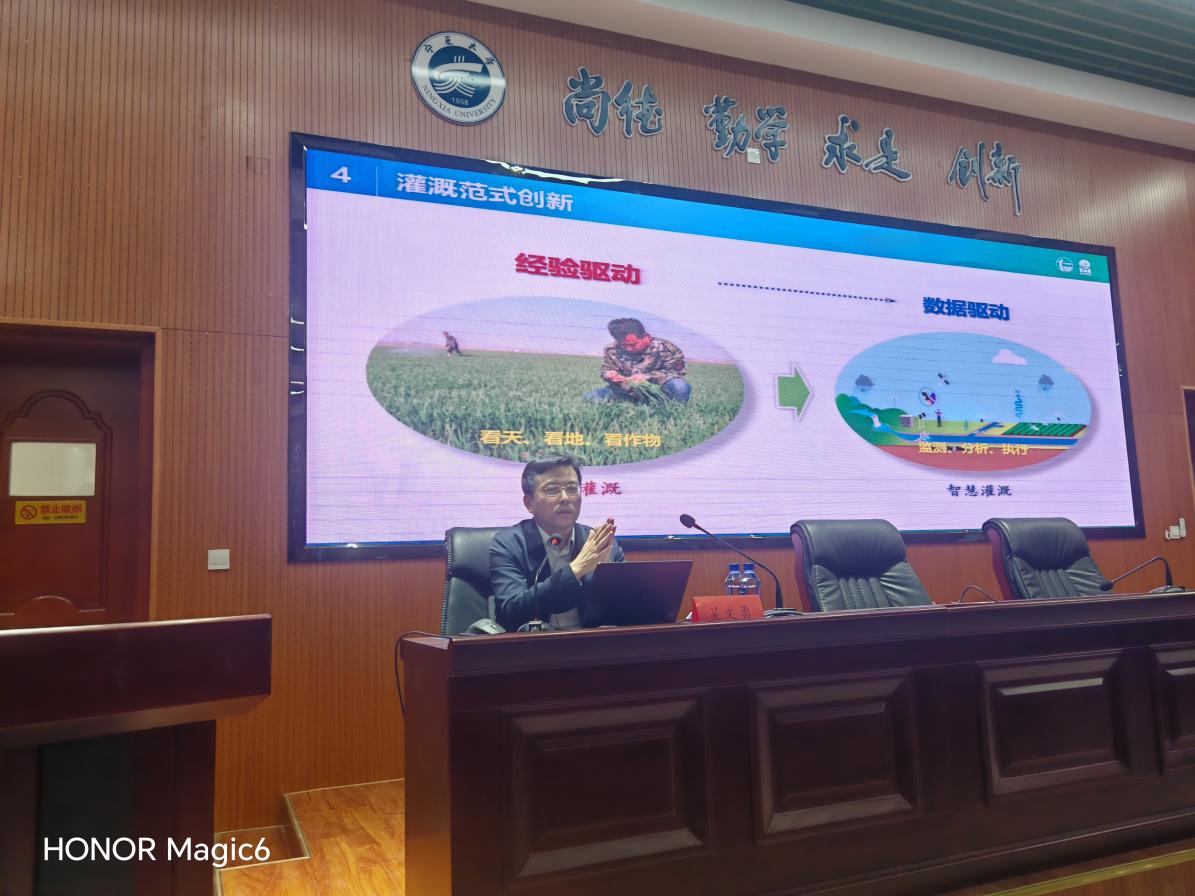 4月15日下午,中国水利水电科学研究院水利研究所副所长吴文勇教授应邀莅临我院,在知行楼三阶报告厅为师生带来了一场题为“智慧灌溉发展前沿与技术关键”的学术报告。报告会由学院副院长李王成主持,学院党总支书记尹娟、副书记冯淑萍、副院长刘海峰出席,水利系教师及智慧水利专业百余名本科生到场聆听学习。