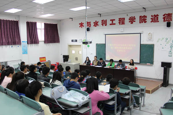 为进一步提高党员发展对象的政治理论水平和党性修养,土木与水利工程学院第三期发展对象培训班于2016年4月6日中午在工科楼三阶顺利开班。土木与水利工程学院党委书记马正亮、党委副书记陆瑜、学办主任郭利、团委书记王娜、水利系党支部书记陶雪梅和土木系党支部书记惠迎新以及40名发展对象参会。