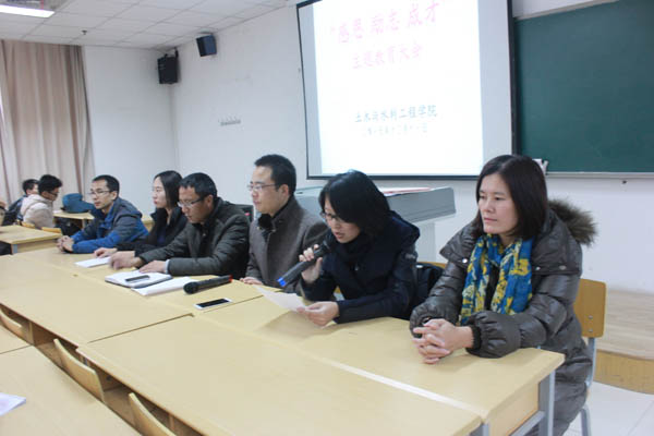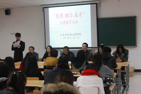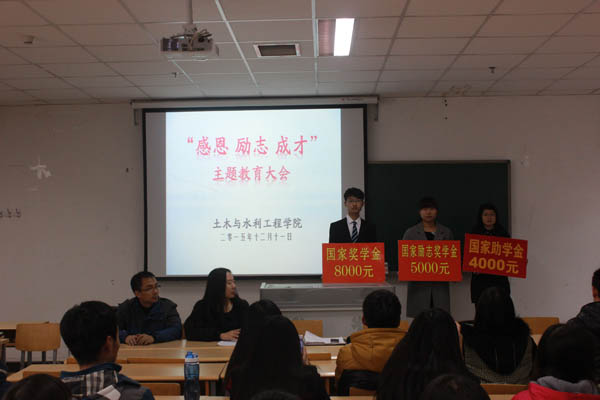 马小凤老师首先对我院本年度各类奖助学金评定工作进行了简单的回顾。王娜老师宣读2015年国家奖学金、国家励志奖学金、国家助学金获得者名单。之后学生代表2014级周浩然、2013级谭一品、2015级张美洁三名同学分别代表国家奖学金、国家励志奖学金、国家助学金获得者先后做了发言,他们表达了对学校、老师辛勤培养的感谢之情,表示会努力学习回报学校、回报社会、回报国家。最后,张强副书记作了总结讲话,他从今年资助政策的变化、学院资助工作的情况两方面入手,对今年的评定工作进行了系统性的总结,对广大同学提出了要有感恩奉献意识、树立自立自强意识,增强勤俭节约意识三个方面的要求,希望同学们能更加努力学习,争取取得更好的成绩。