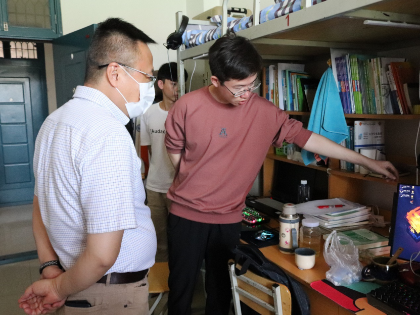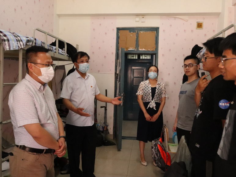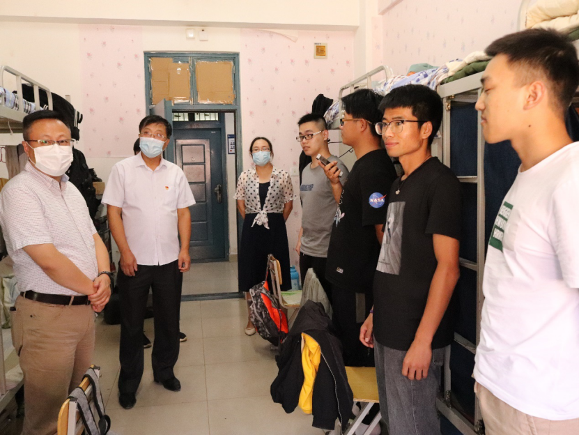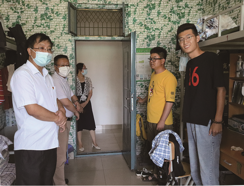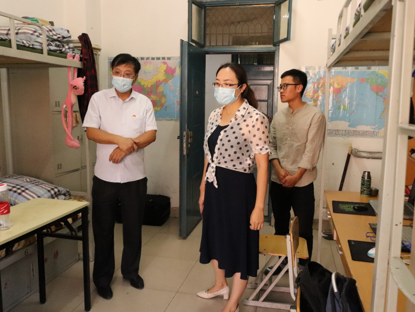 2020年8月31日,土木与水利工程学院党委书记张晓天、院长毛明杰、学生工作办公室主任王娜于15号楼公寓看望返校学生。