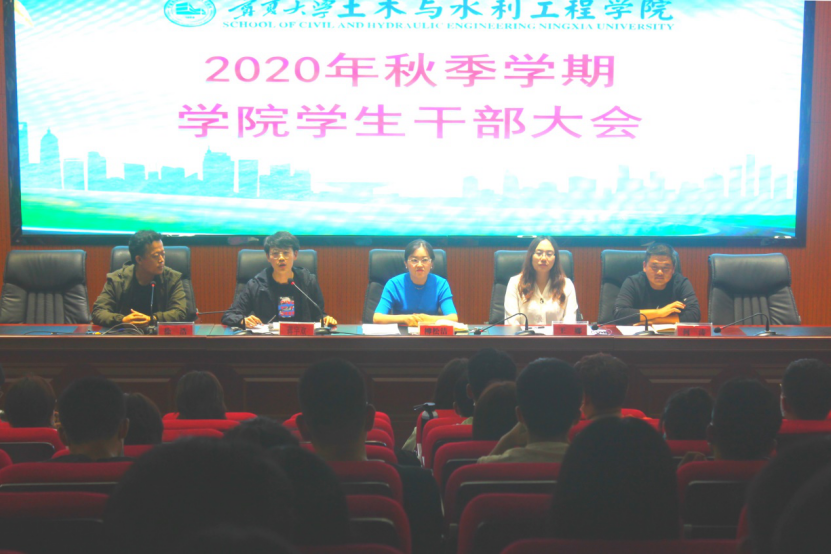 2020年9月9日下午,为后续更加合理有效地的开展工作,土木与水利工程学院在知行楼三楼阶梯教室举办2020年秋季学期学院学生干部大会。出席本次会议的有土木与水利工程学院党委副书记柳松洁、学生工作办公室主任王娜、团委学生会指导老师蒋宇欢、2020级辅导员何涛老师、学生工作办公室老师徐浩和学院全体学生干部。会议由蒋宇欢主持。