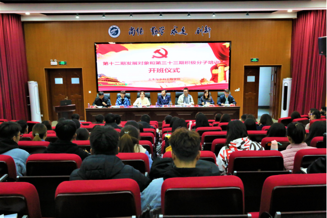 2020年11月12日中午12:30,土木与水利工程学院第十二期党员发展对象与第三十三期入党积极分子培训班开班仪式于知行楼三阶开展。学院党委书记张晓天、党委副书记苏宇静、党委副书记柳松洁、各学生党支部书记、2020年秋季学期积极分子、2020年下半年党员发展对象全体学员参加了本次开班仪式。