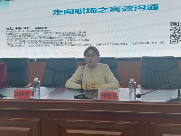 随着就业压力日益激烈,为提升学生的职业规划能力与职业素养,挖掘自我潜能,明确未来努力发展的方向,使大学生能更好的认识就业并帮助其做好职业生涯规划,提升就业竞争力。宁夏大学土木与水利工程学院于2020年11月12日晚7点在知行楼三阶举行“大学生职场沟通”讲座。讲座由学院党委副书记柳松洁主持,信息工程学院党委书记武林波教授主讲,2016、2017级同学参加了此次讲座。