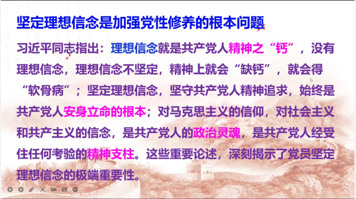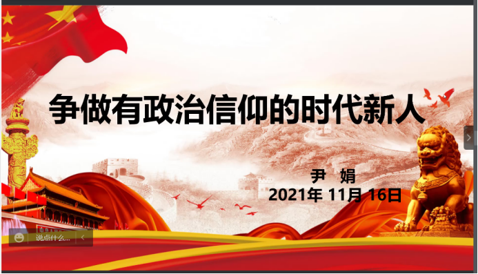 为坚定大家的理性信念和政治信仰,做有理想、有本领、有担当的时代新人,土木与水利工程学院于11月16日晚开展了以“争做有政治信仰的时代新人”为主题的线上党课培训,学院党委副书记尹娟主讲,2021年秋季学期入党积极分子和党员发展对象全体参与,培训由何涛老师主持。