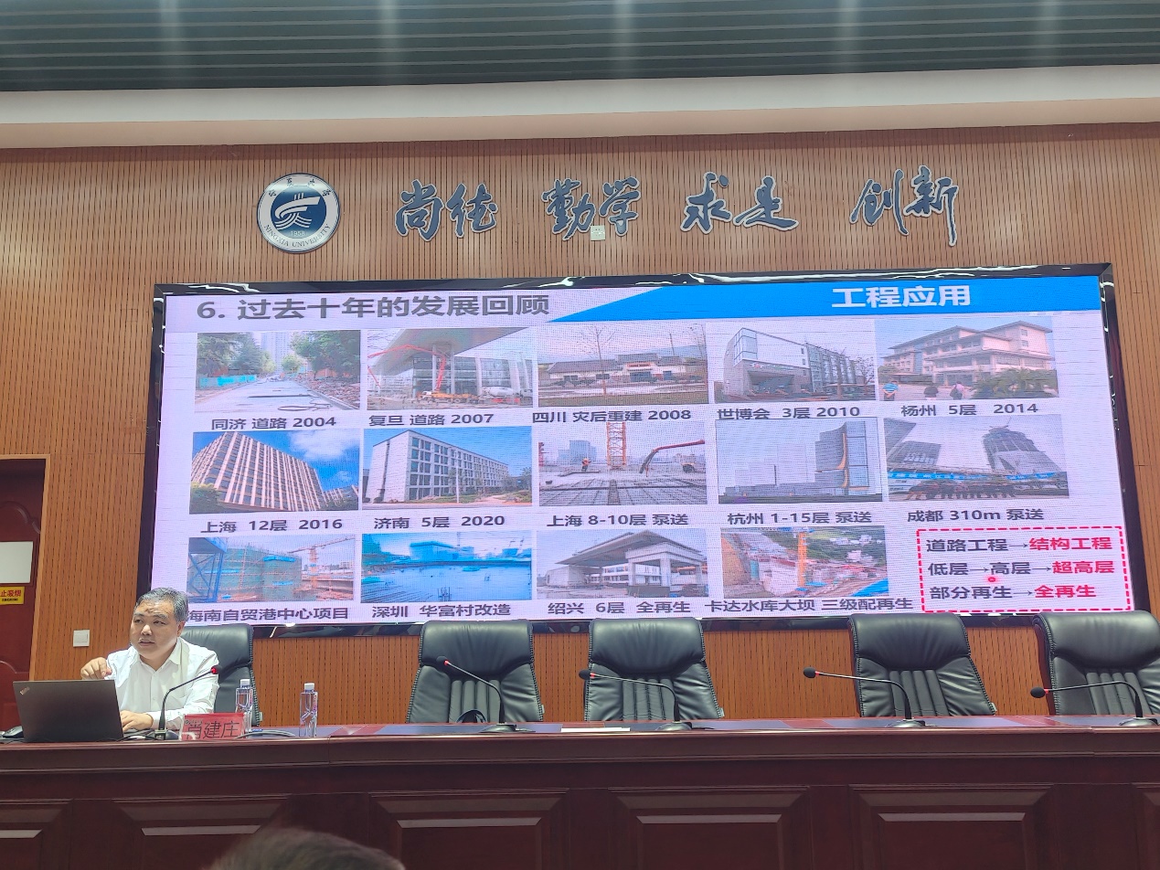 在前沿技术分享环节,肖教授重点介绍了四个创新研究方向:全再生混凝土材料设计与性能调控、组合再生混凝土结构创新与应用、3D打印再生混凝土技术突破与前景展望,以及高附加值功能再生混凝土的开发与应用。通过大量实验数据和工程实例,展示了再生混凝土在实际工程中应用效果,包括其工作性能、耐久性和长期性能等方面的特色与优势。